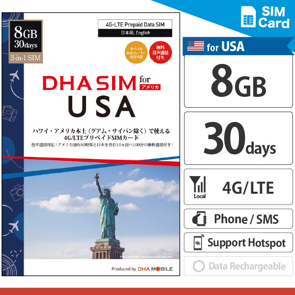 【DHA SIM】 For USA Mainland / Hawaii 8GB / 30 Days Prepaid SIM Card with Free Calls