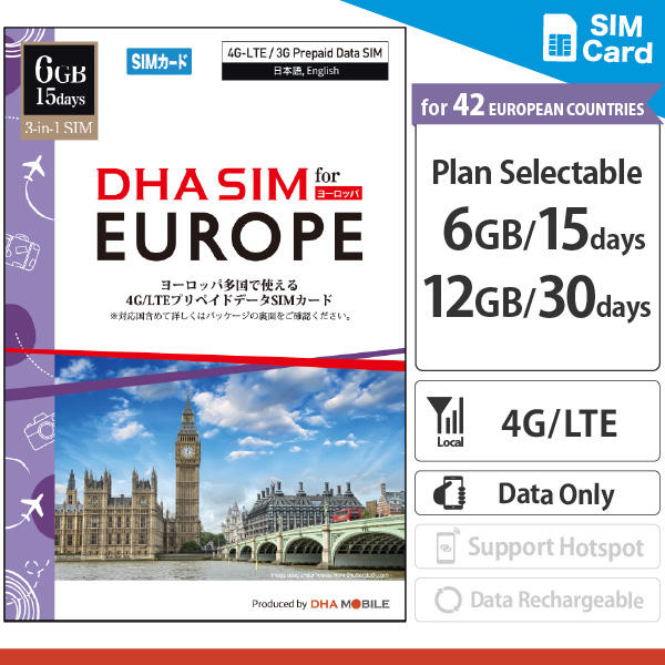 【DHA SIM】 For 42 European Countries Selectable Plans (6GB15days / 12GB30days) Prepaid SIM Card