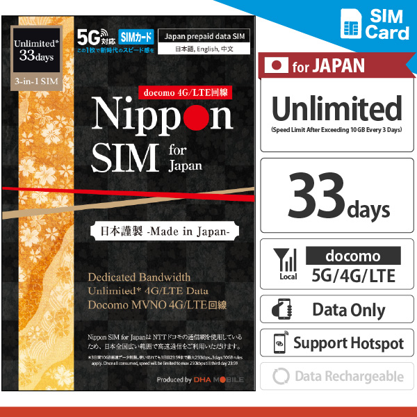 [Nippon SIM] Japan | 33days | Unlimited* Data | docomo Network | Prepaid SIM card