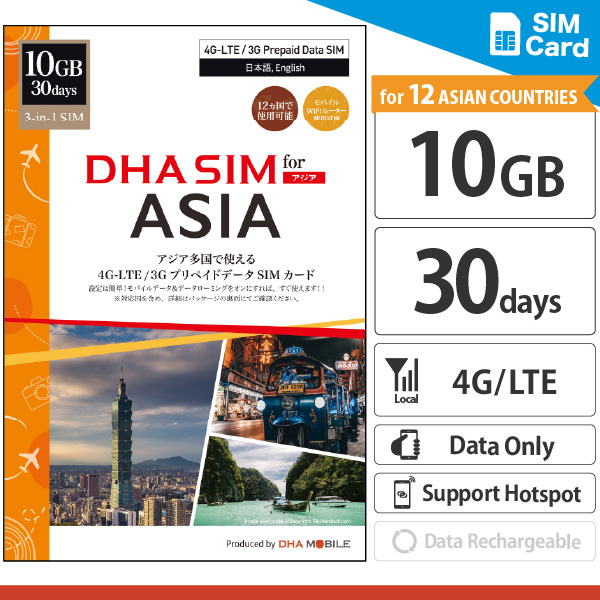 【DHA SIM】 for 12 Asian Countries Including Japan 10GB/30 Days Prepaid SIM Card