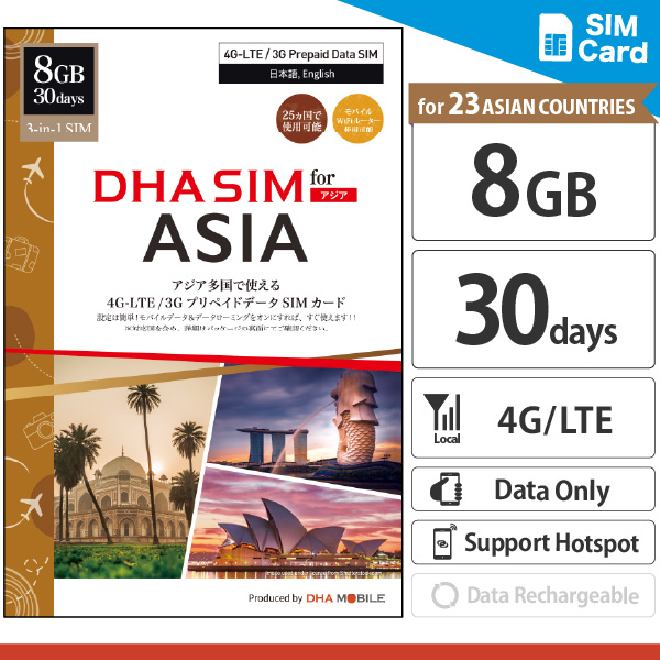 【DHA SIM】 for 23 Asian Countries Including Japan 8GB/30 Days Prepaid SIM Card