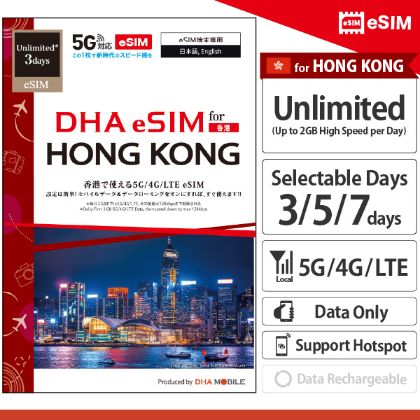 【DHA SIM】 For Hong Kong Unlimited Data (Up to 2GB High Speed per Day) Selectable Days (3 / 5 / 7) Prepaid SIM Card