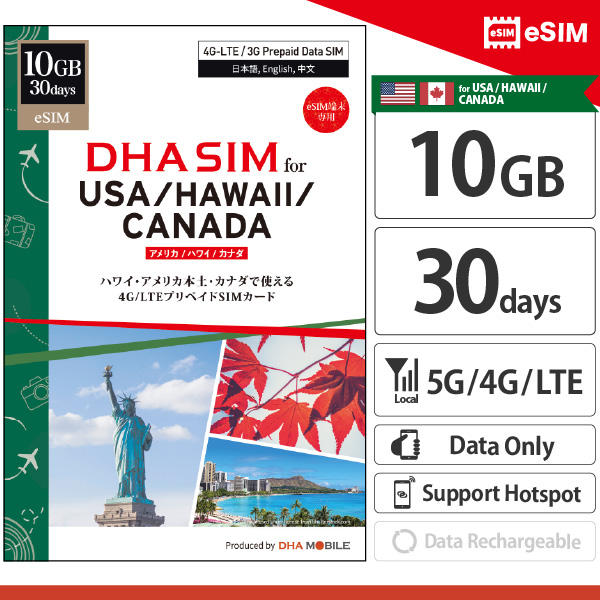 【DHA eSIM】 for USA Mainland/Hawaii/Canada 10GB/30 Days Prepaid eSIM