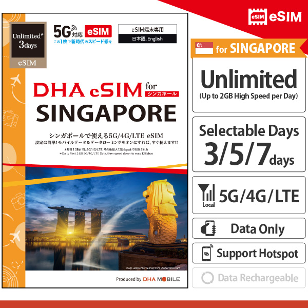 【DHA SIM】 For Singapore Unlimited Data (Up to 2GB High Speed per Day) Selectable Days (3 / 5 / 7) Prepaid eSIM