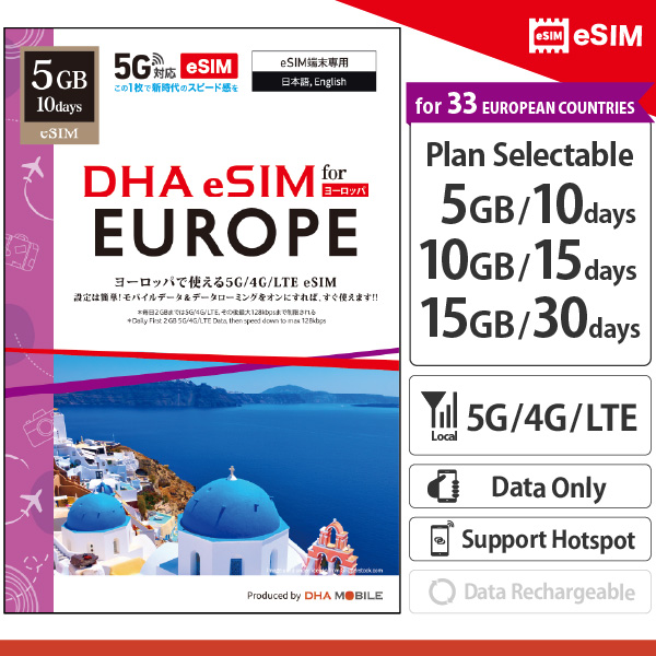 【DHA eSIM】 For 42 European Countries Selectable Plans (5GB10days / 6GB15days) Prepaid eSIM