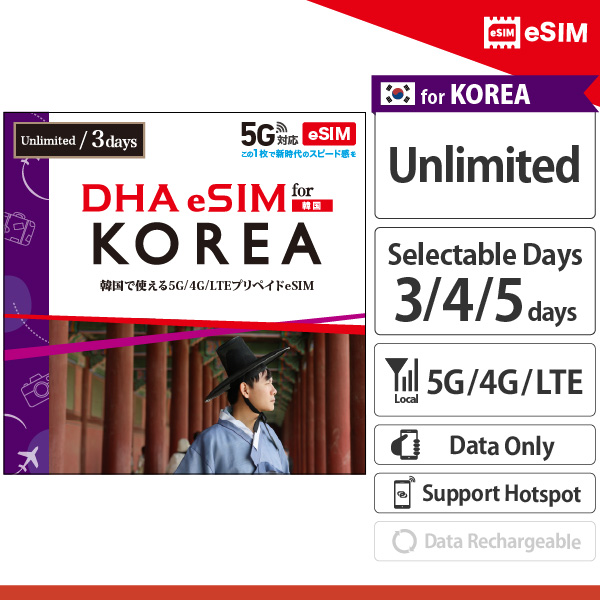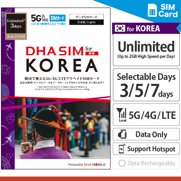 【DHA SIM】 For Korea Unlimited Data (Up to 2GB High Speed per Day) Selectable Days (3 / 5 / 7) Prepaid SIM Card