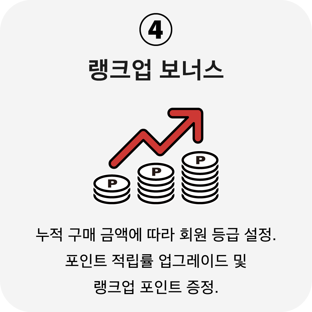 누적 구매 금액에 따라 회원 등급이 설정되며, 포인트 적립률 상승 및 등급 업 시 특별 포인트를 드립니다.