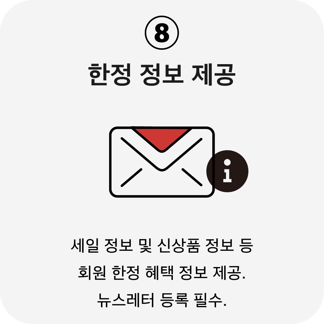 회원 전용 쿠폰, 세일 정보, 신상품 정보 등 뉴스레터 구독자에게 회원 한정 정보를 제공합니다.