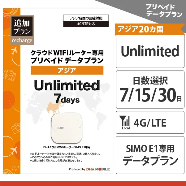 [クラウドWiFi 専用データプラン] アジア20カ国 | データ 無制限 | 7日 / 15日 / 30日 |