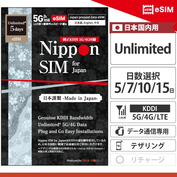 来日旅行客様限定 [Nippon eSIM] 日本 | 5日 / 7日 / 10日 / 15日 | 無制限* データ | KDDI回線 | プリペイド eSIM