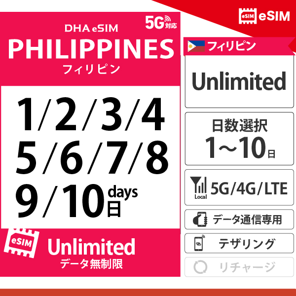 【DHA eSIM】フィリピン | 無制限 | 1日 / 2日 / 3日 / 4日 / 5日 / 6日 / 7日 / 8日 / 9日 / 10日 | プリペイド eSIM