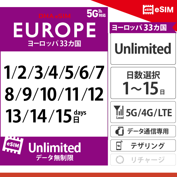 【DHA eSIM】ヨーロッパ33カ国 | 無制限 | 1日 / 2日 / 3日 / 4日 / 5日 / 6日 / 7日 / 8日 / 9日 / 10日 / 11日 / 12日 / 13日 / 14日 / 15日 | プリペイド eSIM