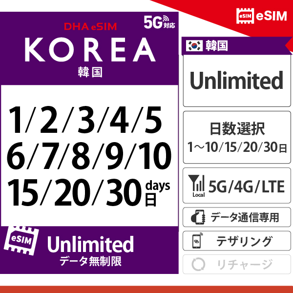【DHA eSIM】韓国 | 無制限 | 1日 / 2日 / 3日 / 4日 / 5日 / 6日 / 7日 / 8日 / 9日 / 10日 / 15日 / 20日 / 30日| プリペイド eSIM
