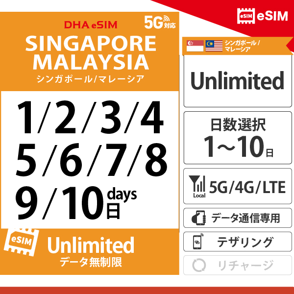 【DHA eSIM】シンガポール / マレーシア | 無制限 | 1日 / 2日 / 3日 / 4日 / 5日 / 6日 / 7日 / 8日 / 9日 / 10日| プリペイド eSIM