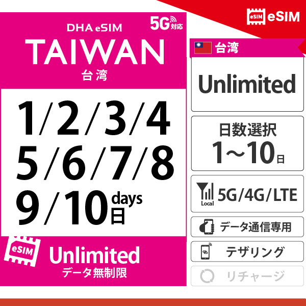 【DHA eSIM】台湾 無制限 日数選択(3日 / 4日 / 5日)プリペイドeSIM