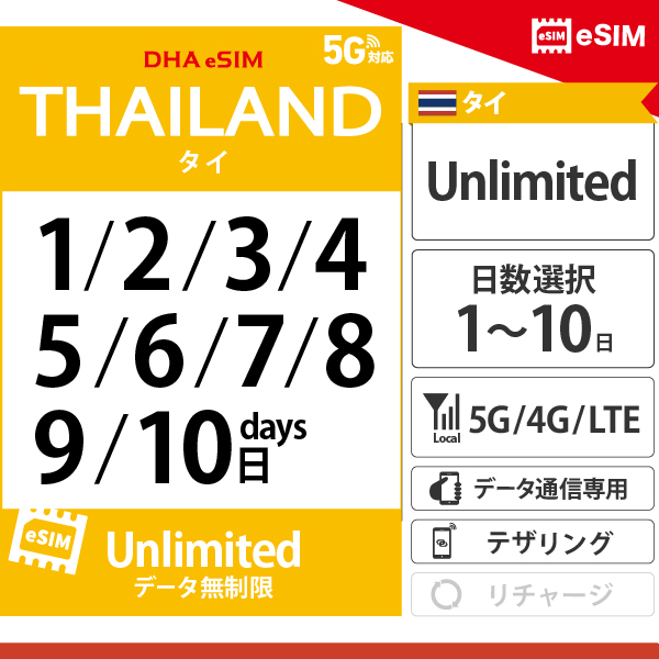 【DHA eSIM】タイ | 無制限 | 1日 / 2日 / 3日 / 4日 / 5日 / 6日 / 7日 / 8日 / 9日 / 10日 | プリペイド eSIM