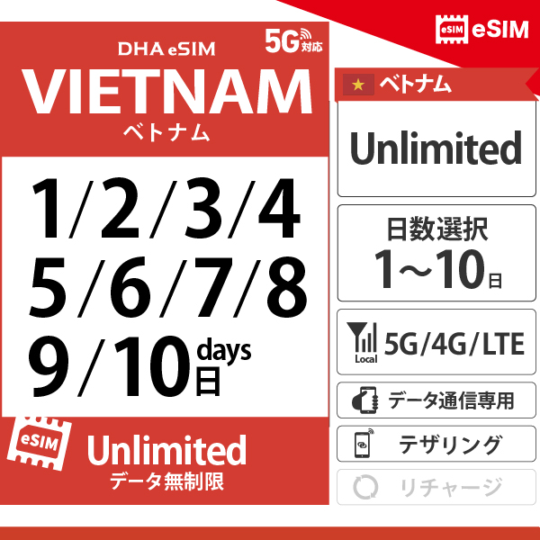 【DHA eSIM】ベトナム | 無制限 | 1日 / 2日 / 3日 / 4日 / 5日 / 6日 / 7日 / 8日 / 9日 / 10日| プリペイド eSIM