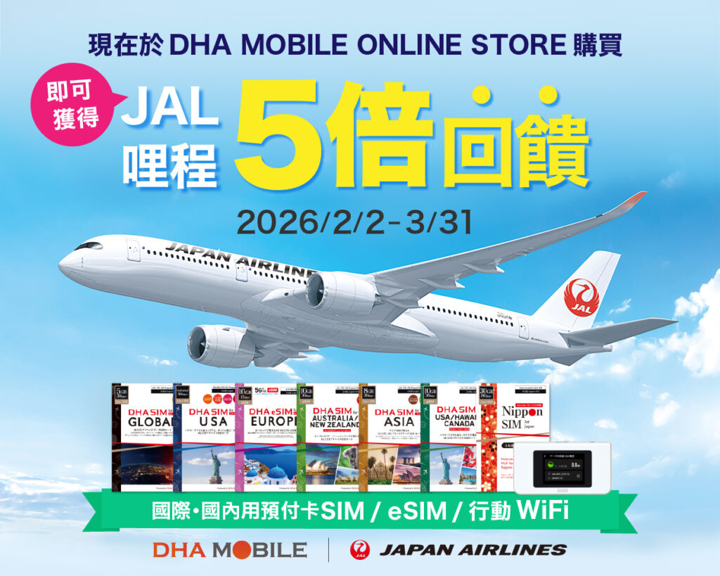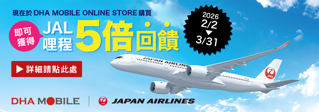 DHA MOBILE 官方線上商店將舉辦限時「JAL哩程5倍送活動」。
