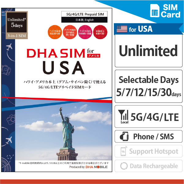 【DHA SIM】 美國本土 / 夏威夷 行動上網吃到飽 任選天數(5天 / 7天 / 12天 / 15天 / 30天)原生門號預付SIM卡