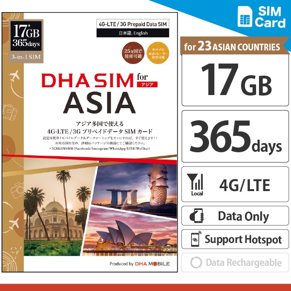 【DHA SIM】 包含日本23個亞洲國家用 17GB/365天預付SIM卡