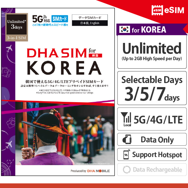 【DHA eSIM】 韓國 行動上網吃到飽 任選天數(3天 / 4天 / 5天)行動上網預付eSIM