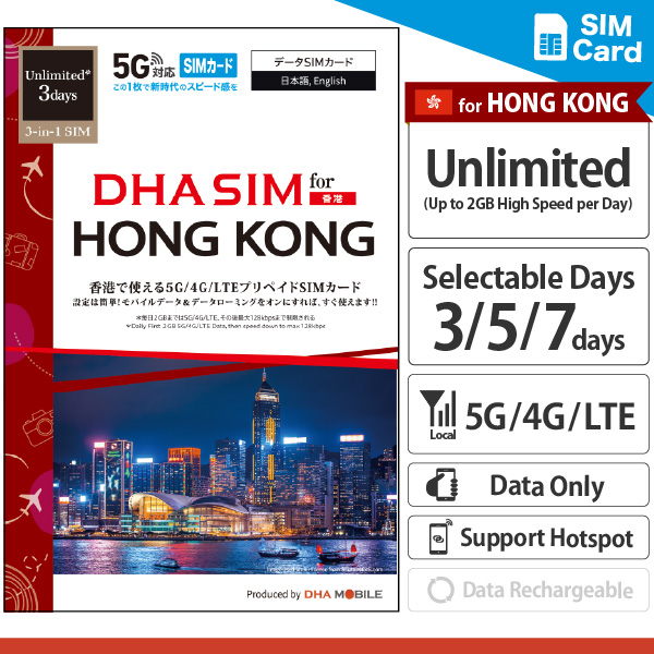 【DHA SIM】 香港 行動上網吃到飽(每日高速2GB)任選天數(3天 / 5天 / 7天)行動上網預付SIM卡