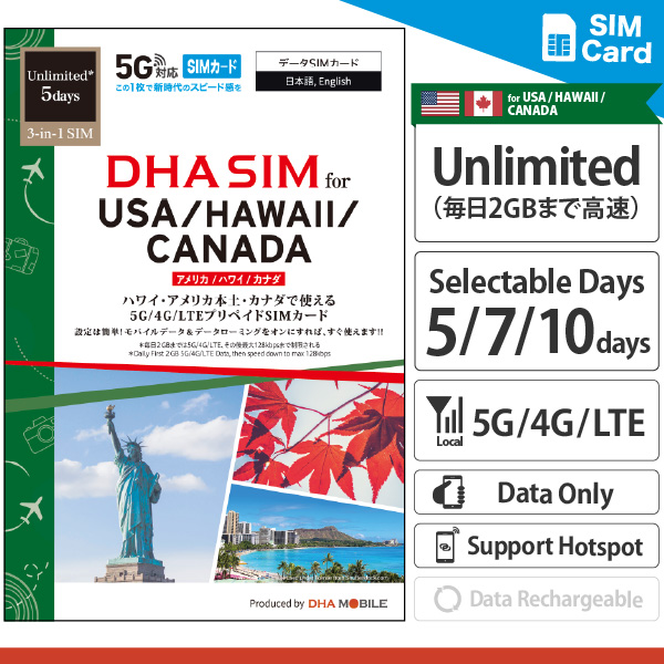 【DHA SIM】 美國 / 加拿大 行動上網吃到飽(每日高速2GB)任選天數(5天 / 7天 / 10天)行動上網預付SIM卡