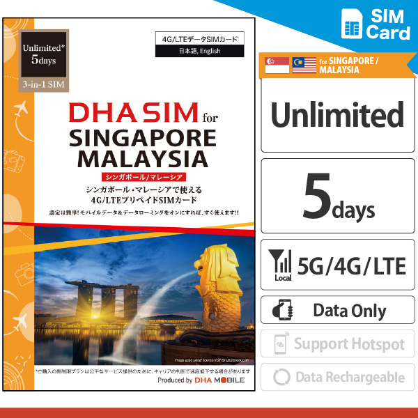 【DHA eSIM】 新加坡 / 馬來西亞 行動上網吃到飽 / 5天 行動上網預付eSIM