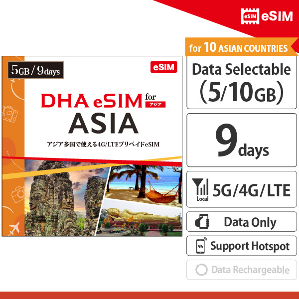 【DHA eSIM】 包含日本 亞洲10國 9天行動網路 流量任選(5GB / 10GB)行動上網預付eSIM
