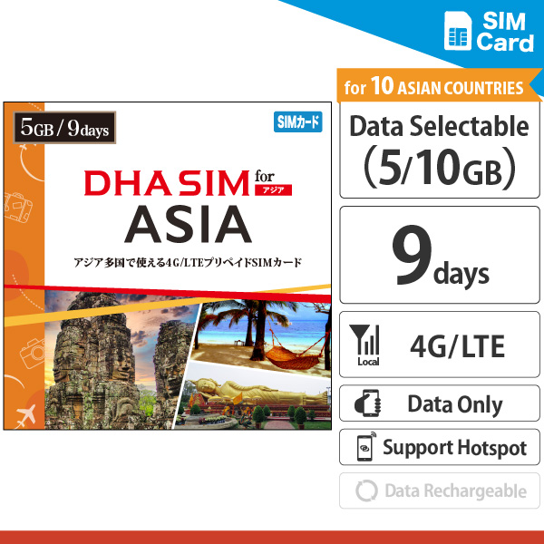 【DHA SIM】 包含日本 亞洲10國 9天行動網路 流量任選(5GB / 10GB)行動上網預付SIM卡